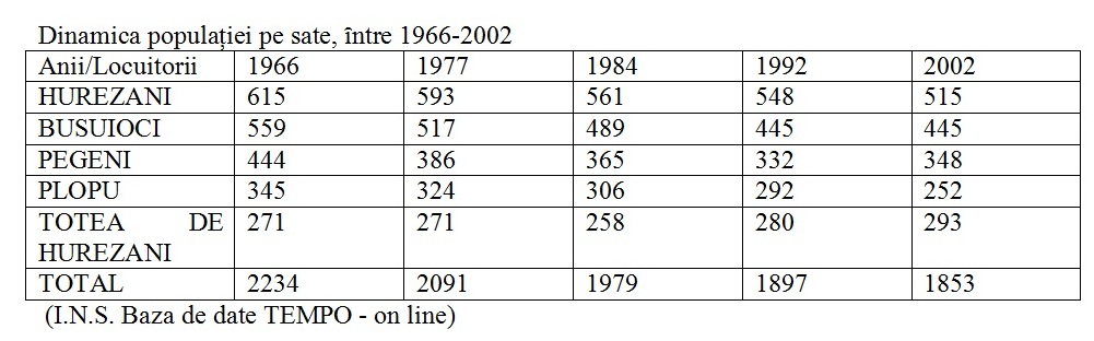 În perioada dintre 1966-2002, s-a constatat că densitatatea populației era de 48, 26 loc/km pătrat, situând comuna Hurezani în rândul comunelor gorjene cu o concentrație medie a populației, peste media rurală pe județ, de 47 loc/km pătrat și sub media pe ţară, care era de 71 loc/km pătrat. După mărimea satelor, se remarcă satul Hurezani, cu peste 500 de locuitori şi satele Busuioci şi Pegeni, cu 300 şi respectiv, 500 de locuitori, după care urmează satele Plopu şi Totea, cu 200 şi respectiv, 300 de locuitori. Comuna Hurezani s-a aflat mereu sub media pe județ, unde cele mai frecvente sunt satele cu 200 până la 500 de locuitori și cele cu 500 până la 1000 de locuitori. Analizele efectuate evidenţiază faptul că după 1991, se constată o tendinţă de scădere, de la un an la altul, a numărului populaţiei localităţii, ceea ce confirmă ipoteza privitoare la depopularea mediului rural din Gorj, deci, şi a comunei Hurezani, în cadrul unui proces care s-a accentuat şi se continuă şi astăzi!