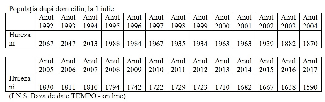 Comuna Hurezani este un exemplu relevant de comună de talie mică, în care populaţia a scăzut de la 2057 locuitori în anul 1992, la 1939 în 2002, la 1717, în 2011 şi la 1599 persoane, la 1 ianuarie 2018