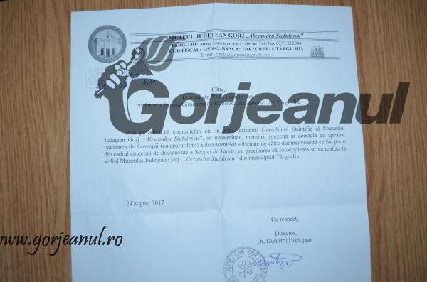 Pus în mișcare abia după ce slavistul Cosmin Vilău a sesizat Gorjeanul că nu primește acces la documentele dorite din arhiva Muzeului Județean Gorj, directorul instituției publice, Dumitru Hortopan, a întrunit Consiliul Științific și a dat o aprobare pe jumătate pentru solicitant. Mai exact, asemeni lui Stalin, care a răpit României cu creionul gros Ținutul Herța, și Hortopan a decis să-i aprobe profesorului doar fotocopierea documentelor dorite, omițând, în mod suspect, să aprobe și activitatea de cercetare științifică(care se face direct pe original, nu pe fotocopii). În replică, Vilău a contestat aprobarea ciuntită a accesului său în arhiva instituției publice.