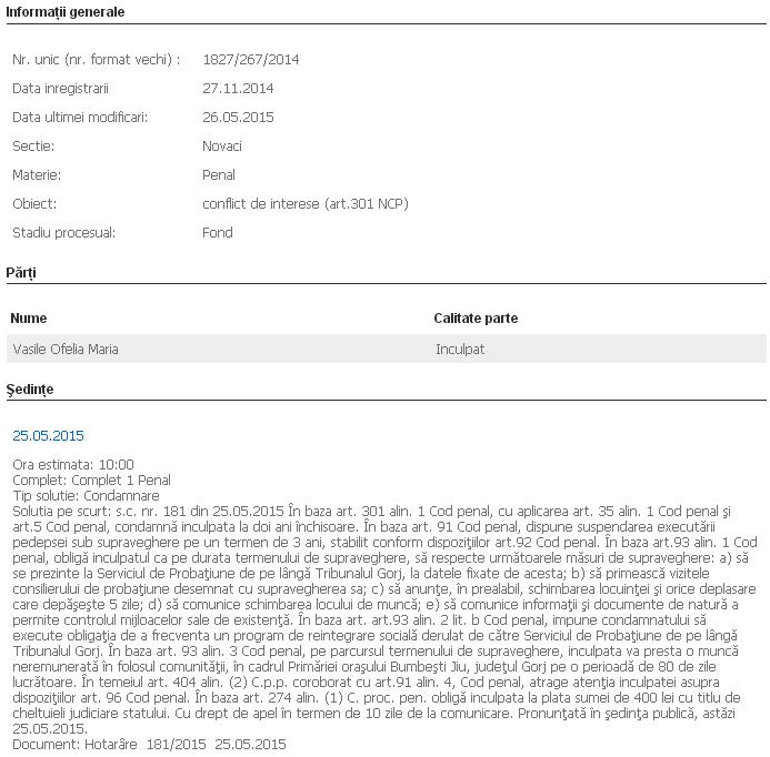Ofelia Vasile a fost cercetată de procurorii PCA Craiova anul trecut, în urma unor sesizări făcute şi de instituţia publică unde aceasta a fost secretar. Mai exact, Ofelia Vasile a ocupat funcţia respectivă în perioada 2009-2012, transferându-se, la cerere, apoi la Primăria Târgu-Jiu, pe un post inferior. Ea nu fusese niciodată titulară a postului de la Săcelu, ocupând funcţia trei ani prin dispoziţia fostului primar, Ion Voica, cu care are şi în prezent o relaţie destul de apropiată, lucru care nu este negat nici de fratele ei vitreg. În cei trei ani de activitate pe postul de secretar al primăriei, Ofelia Vasile, a întocmit mai multe acte care pun semne serioase de întrebare legate de interesul pe care îl urmărea respectiva. Oricum, interesul local nu a primat pentru fostul secretar, dovadă şi acest dosar penal în care figurează ca şi inculpat şi condamnarea recentă. “În baza art. 301 alin. 1 Cod penal, cu aplicarea art. 35 alin. 1 Cod penal şi art.5 Cod penal, condamnă inculpata la doi ani de închisoare. În baza art. 91 Cod penal, dispune suspendarea executării pedepsei sub supraveghere pe un termen de 3 ani, stabilit conform dispoziţiilor art.92 Cod penal. În baza art.93 alin. 1 Cod penal, obligă inculpatul ca pe durata termenului de supraveghere, să respecte următoarele măsuri de supraveghere: a) să se prezinte la Serviciul de Probaţiune de pe lângă Tribunalul Gorj, la datele fixate de acesta; b) să primească vizitele consilierului de probaţiune desemnat cu supravegherea sa; c) să anunţe, în prealabil, schimbarea locuinţei şi orice deplasare care depăşeşte 5 zile; d) să comunice schimbarea locului de muncă; e) să comunice informaţii şi documente de natură a permite controlul mijloacelor sale de existenţă. În baza art. art.93 alin. 2 lit. b Cod penal, impune condamnatului să execute obligaţia de a frecventa un program de reintegrare socială derulat de către Serviciul de Probaţiune de pe lângă Tribunalul Gorj. În baza art. 93 alin. 3 Cod penal, pe parcursul termenului de supraveghere, inculpata va presta o muncă neremunerată în folosul comunităţii, în cadrul Primăriei oraşului Bumbeşti Jiu, judeţul Gorj pe o perioadă de 80 de zile lucrătoare. În temeiul art. 404 alin. (2) C.p.p. coroborat cu art.91 alin. 4, Cod penal, atrage atenţia inculpatei asupra dispoziţiilor art. 96 Cod penal. În baza art. 274 alin. (1) C. proc. pen. obligă inculpata la plata sumei de 400 lei cu titlu de cheltuieli judiciare statului”, se arată în sentinţa ce poate fi atacată cu apel.