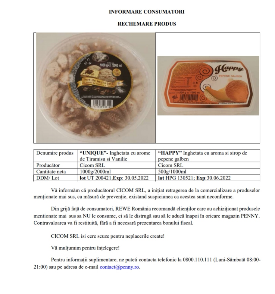 Autoritatea Națională Sanitar-Veterinară pentru și pentru Siguranța Alimentelor (ANSVSA) a anunțat retragerea de la comercializare a două sortimente de înghețată care pun în pericol sănătatea consumatorilor, fără a preciza motivul retragerii. Înghețata este vândută de lanțul de magazine Penny.