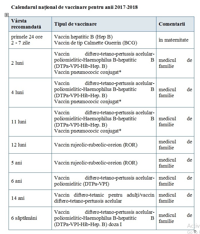 Vaccinarea împotriva bolilor transmisibile prevenibile prin vaccinare este esenţială pentru protejarea sănătăţii populaţiei, atenţionează Organizaţia Mondială a Sănătăţii (OMS). Calendarul național de vaccinare în România, prevăzut în Ordinul Ministrului Sănătății nr. 377/2017 din 30 martie 2017, privind aprobarea Normelor tehnice de realizare a programelor naţionale de sănătate publică pentru anii 2017 şi 2018 prevede că în primul an de viaţă al copilului, acesta este vaccinat în maternitate şi apoi trebuie dus la medicul de familie pentru următoarele vaccinuri. Ultimul vaccin se face la vârsta de 14 ani.