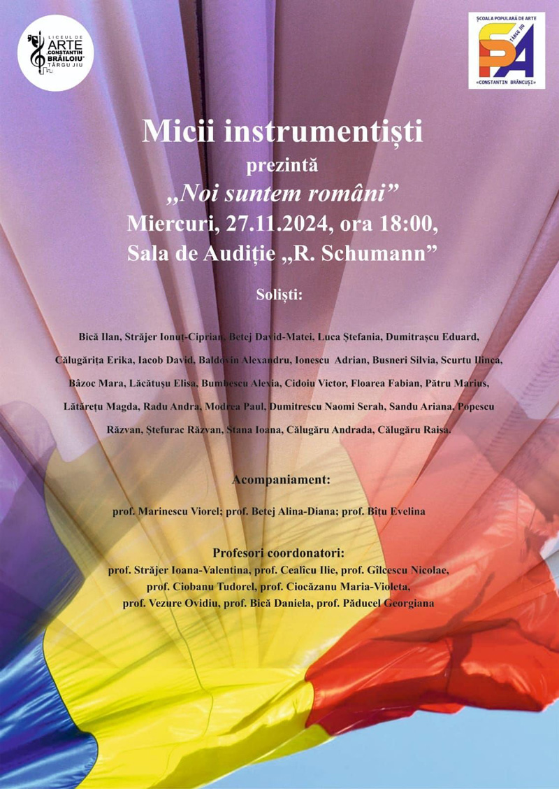 ,,Sub genericul ,,Micii instrumentiști” vă aducem în dar muzică pentru suflet. Vă invităm la un spectacol muzical deosebit dedicat Zilei Naționale a României! Micii instrumentiști de la Liceul de Arte ,,Constantin Brăiloiu” Târgu Jiu și din cadrul Școlii Populare de Arte ,,Constantin Brâncuși” Târgu Jiu vă vor încânta cu un program artistic select din creațiile marilor compozitori precum Ciprian Porumbescu, Johannes Brahms, Ludwig van Beethoven, Wolfgang Amadeus Mozart, dar și prin îndrăgitele noastre cântece patriotice care ne fac inimile să vibreze de mândrie și bucurie. Tinerii noștri artiști, sub îndrumarea atentă a profesorilor coordonatori, vor aduce pe scenă pasiunea și talentul lor într-un recital ce sărbătorește spiritul și cultura românească. Intrarea este liberă, iar prezența dumneavoastră va fi cea mai frumoasă încurajare pentru micii noștri instrumentiști! Vă așteptăm cu drag să sărbătorim împreună Ziua Națională a României!”, au transmis reprezentanții Școlii Populare de Arte Târgu Jiu.