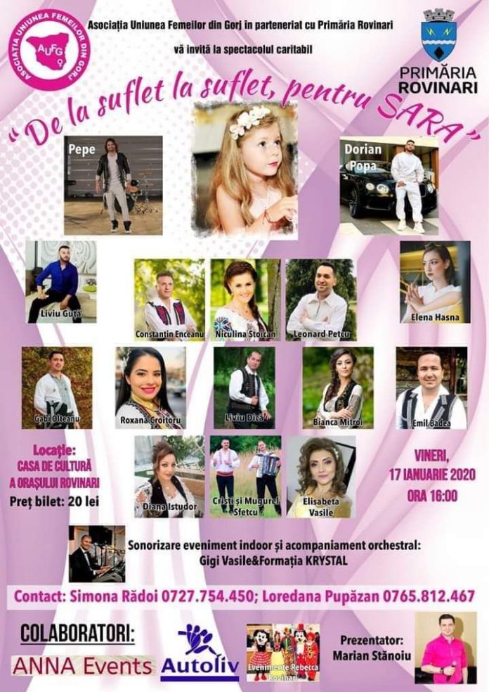 Asociația Uniunea Femeilor din Gorj întinde din nou o mână de ajutor pentru cei aflați în dificultate. De această dată, cea care va beneficia de susținere din parte acestei asociații va fi Sara, o fetiță în vârstă de doar 7 ani, ale căror costuri privind tratamentul de leucemie pe care îl urmează sunt foarte ridicate. Astfel, în parteneriat cu Primăria Rovinari, Asociația Uniunea Femeilor din Gorj organizează vineri, 17 ianuarie, la Casa de Cultură a orașului Rovinari, un spectacol caritabil în cadrul căruia vor urca pe scenă artiști consacrați.,,Hai să dăm mână cu mână cel cu inima română, haideți cu noi pentru Sara! Anul 2020 îl începem cu un extraordinar spectacol umanitar cu artiști consacrați. Costul unui bilet este doar 20 lei! Sara este un pui de om în vârstă de 7 anișori care suferă de leucemie. Acum se află internată într-un spital din Italia, medicii fac tot posibilul pentru ca micuța să zâmbească din nou, însă costurile sunt foarte mari. De aceea e nevoie de noi toți cei care pot și vor să doneze pentru ca Sara să se facă bine. Donați și gândiți-vă că fiecare bănuț pe care îl dăruiți înseamnă sănătate și o viață normală pentru Sara! Donațiile se pot face și în contul Asociației Uniunea Femeilor din Gorj cu mențiunea <pentru Sara> RO91 RNCB 0779 1597 8120 0001 BCR Târgu Jiu. Vă așteptăm cu drag la spectacol!”, au transmis organizatorii evenimentului.