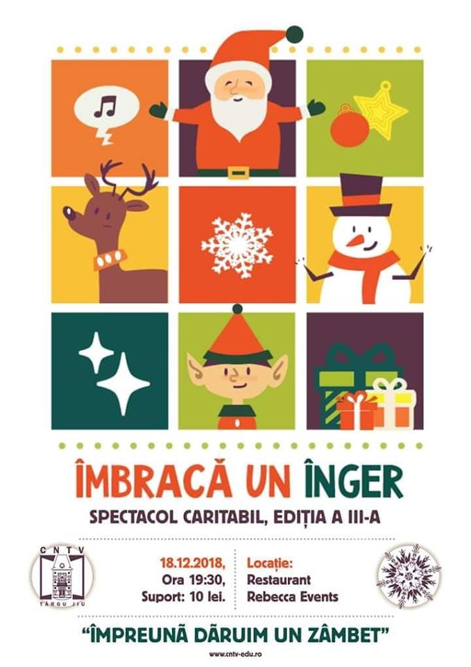 Marți, 18 decembrie, Colegiul Național Tudor Vladimirescu (CNTV) organizează cea de-a treia ediție a spectacolului caritabil Îmbracă un Înger. Evenimentul începe la ora 19:30 și se desfășoară la restaurantul Rebecca Events.