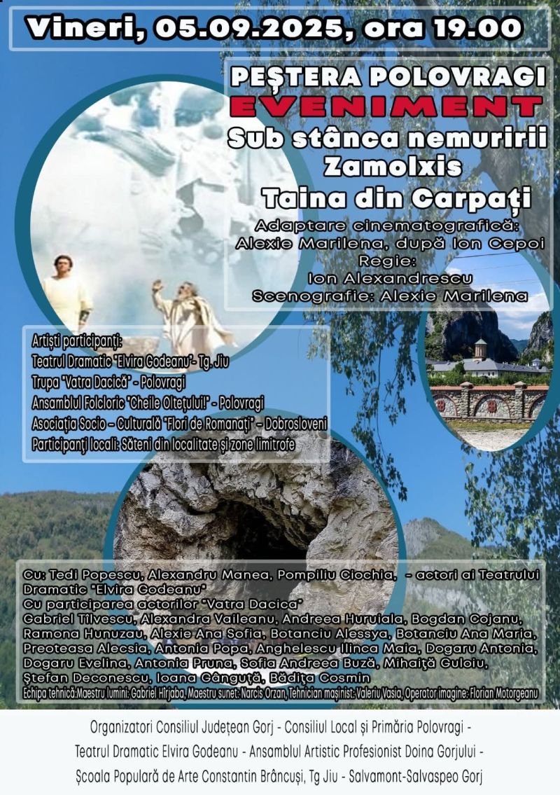 Vineri, 5 septembrie 2025, Peștera Polovragi, din județul Gorj, va fi locul de desfășurare al unui eveniment cultural inedit: este vorba de spectacolul ,,Sub stânca nemuriri – Zamolxis: Taina din Carpați”, o adaptare cinematografică de Alexie Marilena, după un text de Ion Cepoi.