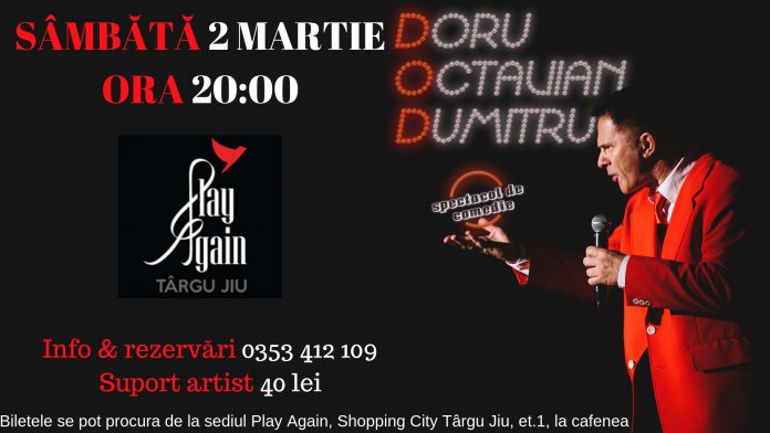 „Întâmpină primăvara cu voie bună! Vino și tu pe 2 martie la un super spectacol cu Doru Octavian Dumitru pentru o seară pe cinste alături de prietenii tăi! Biletele sunt puse la vânzare în locaţia Play Again din Târgu Jiu – Shopping City, et.1, la cafenea”, anunţă organizatorii. Preţul unui bilet este 40 lei.