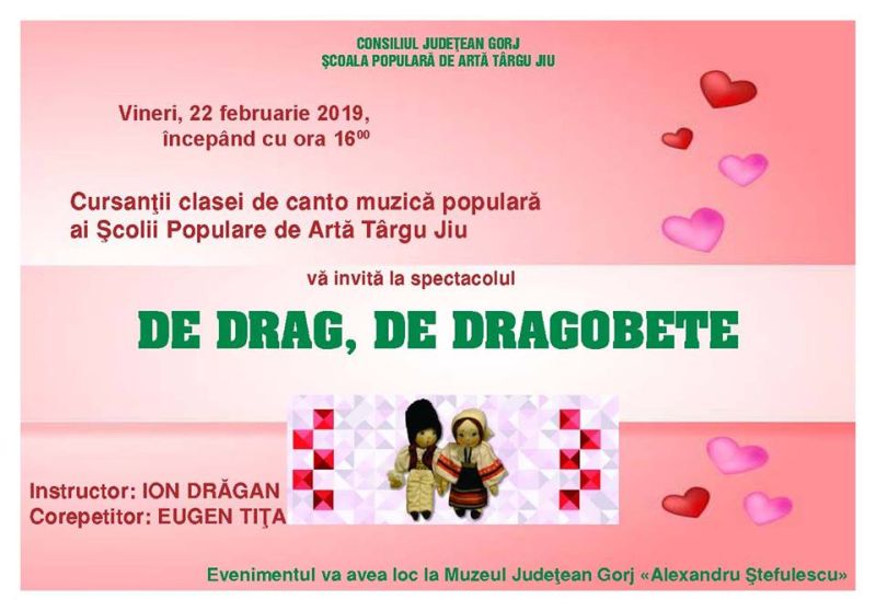 “De drag, de Dragobete” este genericul minispectacolului oferit de Școala Populară de Artă Târgu-Jiu cu ocazia sărbătoririi zilei de Dragobete. Această audiție este dedicată în exclusivitatea iubirii și este susținută de cursanții clasei de canto muzică populară, coordonați de profesorul și interpretul Ion Drăgan. Evenimentul va avea loc vineri, 22 februarie 2019, începând cu ora 16.00, la Muzeul Județean Gorj “Alexandru Ștefulescu”. Sunt așteptați toți iubitorii cântecului popular gorjenesc, intrarea fiind liberă.