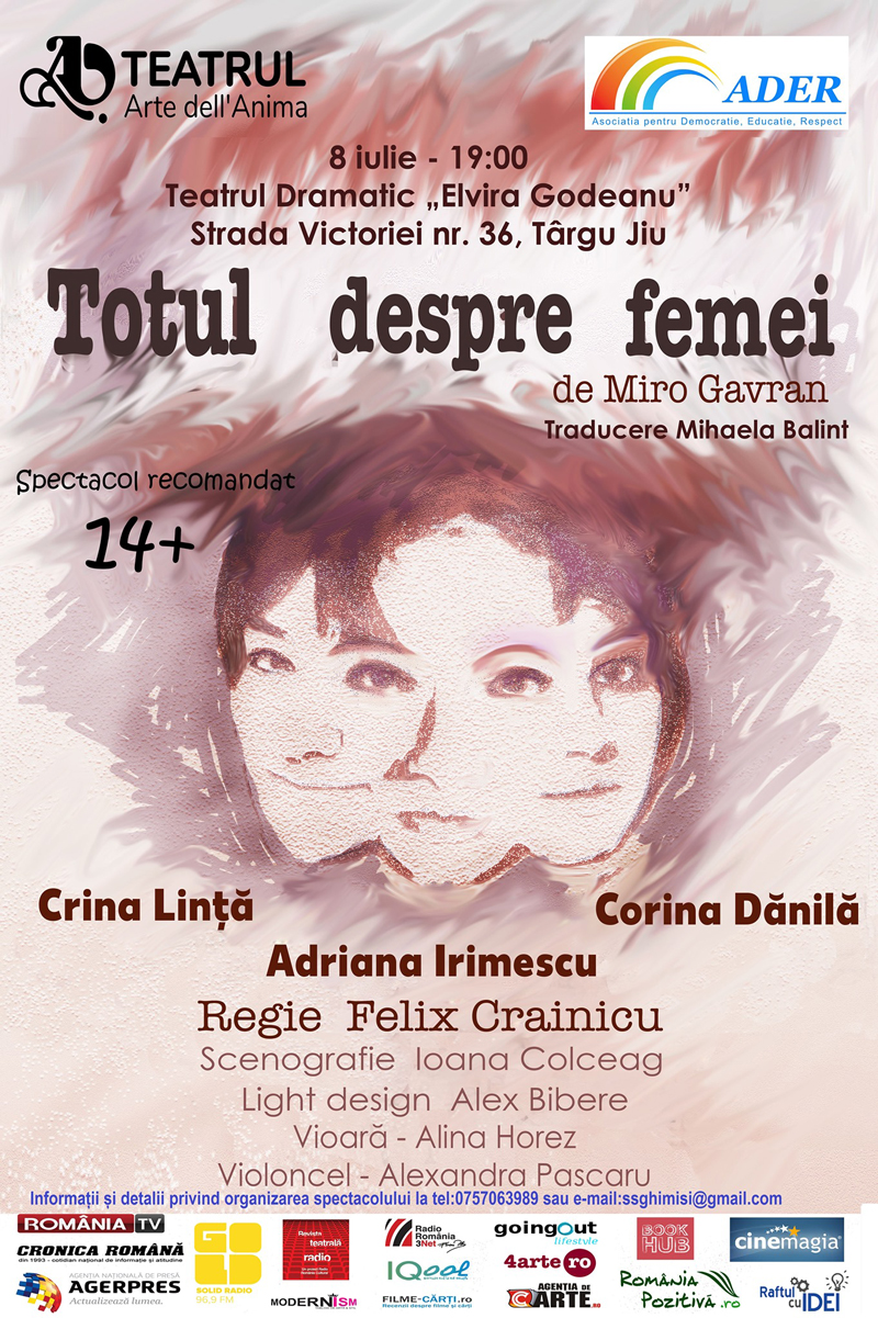 Teatrul Arte dell”Anima va prezenta producția sa, ,,Totul despre femei”, de Miro Gavran, în regia lui Felix Crainicu; o comedie romantică extraordinară cu Corina Dănilă, Crina Lință și Adriana Irimescu. ,,Într-un melanj unic, „Totul despre femei” aduce o poveste de iubire, una de carieră și una de prietenie, plus un conflict puternic stârnit de trei fetițe la grădiniță. Nu e suficient? Adăugăm o luptă plină de gelozie între respectabilele nanogenare îndrăgostite și imaginea este completă. „Totul despre femei” – o comedie romantică care te va pune pe gânduri. Sumele atrase în urma acestui eveniment vor fi folosite pentru proiectul ,,Dăruiește pentru viitor”, proiect prin care ne propunem să aducem copiilor din medii defavorizate, în prima zi de școală din septembrie, ghiozdane pline cu cele necesare unui elev. Invitații se pot obține la numărul de telefon: 0757.063.989 sau la email: ssghimisi@gmail.com. Donația minimă este de 50 de lei și se poate face în contul RO86BTRLRONCRT0239526902, deschis la Banca Transilvania”, au transmis organizatorii.