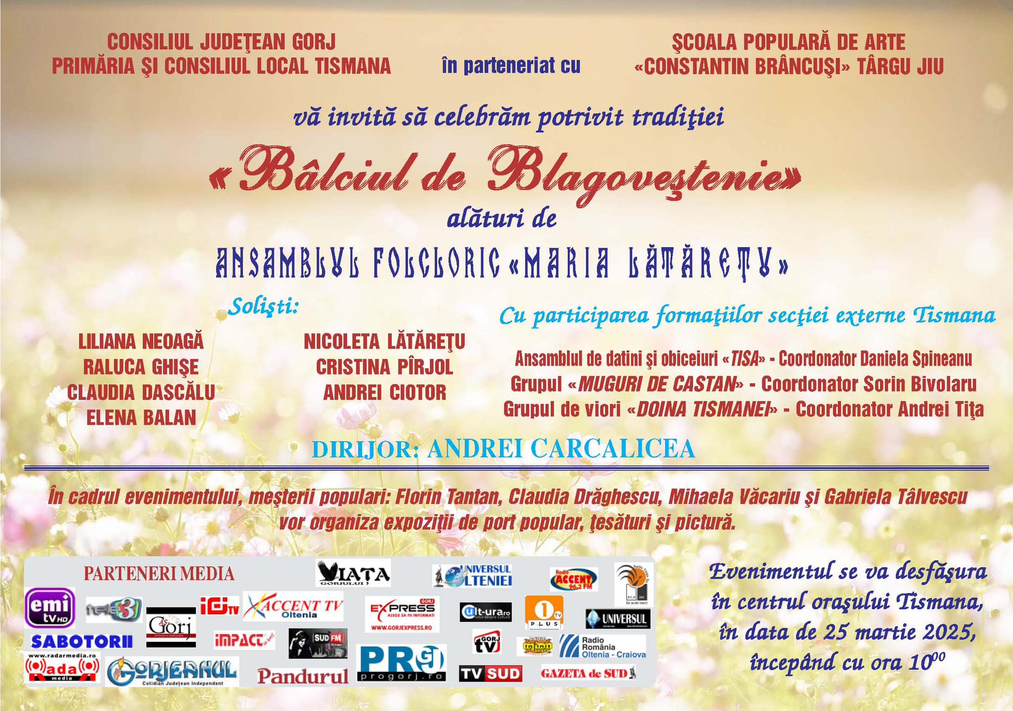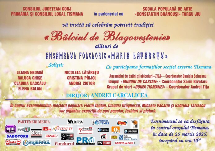 Mâine, 25 martie 2025, începând cu ora 10:00, la Tismana, în zona mirifică a Gorjului, va avea loc tradiționalul Bâlci de Blagoveștenie. În cadrul evenimentului va avea loc un spectacol al tinerilor artiști din cadrul Școlii Populare de Arte ”Constantin Brâncuși” Târgu Jiu.
