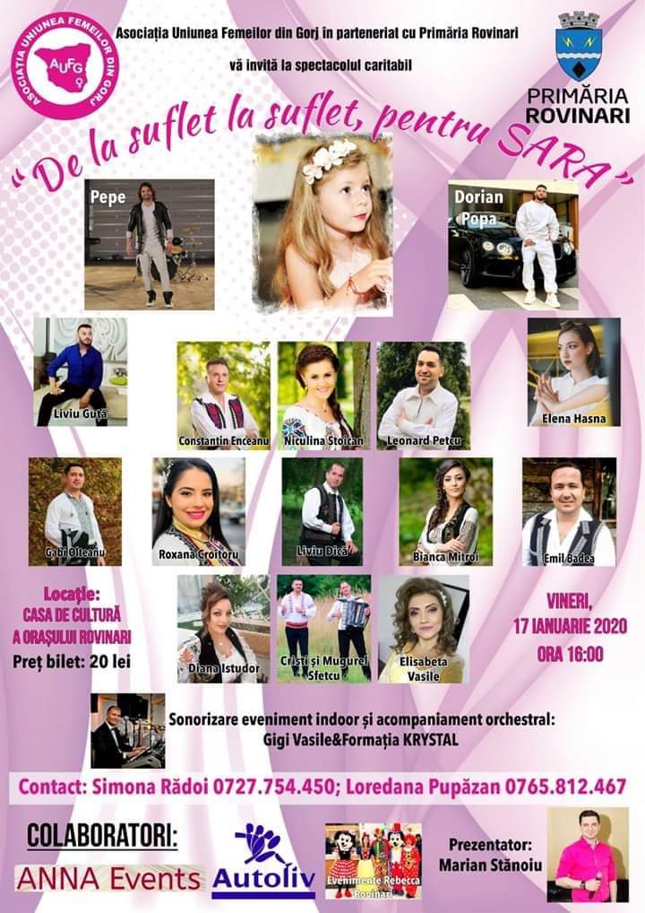 „Hai să dăm mână cu mână cel cu inima română, haideți cu noi pentru Sara! Anul 2020 îl începem cu un extraordinar spectacol umanitar cu artiști consacrați. Costul unui bilet este doar 20 lei! Sara este un pui de om în vârstă de 7 anisori care suferă de leucemie. Acum se află internată într-un spital din Italia, medicii fac tot posibilul pentru ca micuta să zâmbească din nou, însă costurile sunt foarte mari. De aceea e nevoie de noi toți cei care pot și vor să doneze pentru ca Sara să se faca bine. Donati și ganditi-va că fiecare bănuț pe care îl dăruiți înseamnă sănătate și o viață normală pentru Sara! Donațiile se pot face și în contul Asociației Uniunea Femeilor din Gorj cu mențiunea <<pentru Sara>> RO91 RNCB 0779 1597 8120 0001 BCR Târgu Jiu. Vă așteptăm cu drag la spectacol!”, au transmis organizatorii evenimentului.