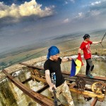 Marius, tânărul de 23 de ani, din Cluj, care a făcut furori pe internet, după ce s-a urcat pe un turn înalt de peste 250 de metri, s-a întors în weekend la Târgu-Jiu. De această dată, bărbatul care străbate țara în lung și în lat cu tirul nu a urcat singur pe clădire, ci alături de Flaviu Cernescu, un timișorean pasionat de sporturi extreme.  Cei doi au fluturat drapelul României , iar Marius s-a filmat în timp ce stătea agăţat într-o mână la peste 250 de metri înălţime, fără nicio măsură de securitate. Imaginile surprinse de cameră sunt de-a dreptul incredibile. La un moment dat se observă cum un lemn cade în gol, însă clujeanul nu și-a  pierdut concentrarea. Ca și nu ar fi fost de ajuns, ”Spiderman de România” a mers și mai departe cu demonstrațiile spectaculoase.