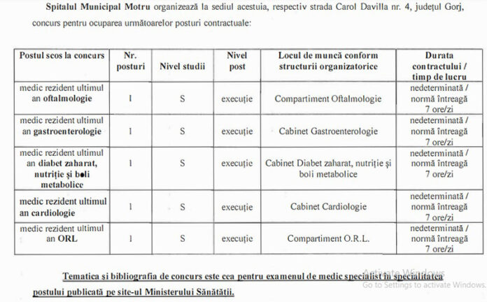 Două spitale din județul Gorj au posturi vacante pentru medici. Spitalul Municipal Motru recrutează cinci rezidenți în ultimul an pentru compartimentele de Oftalmologie și ORL și cabinetele de Gastroenterologie, Diabet zaharat, nutriție și boli metabolice și Cardiologie. Posturile sunt cu normă întreagă și pe perioadă nedeterminată.