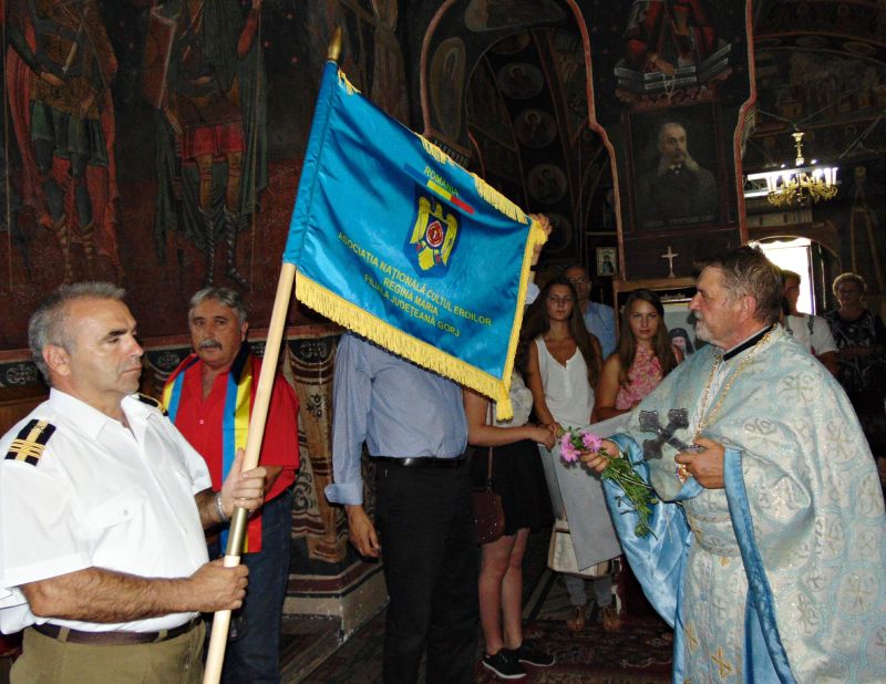Istoricul Andrei Popete-Pătrașcu ne-a declarat că: “Steagul de identificare al A.N.C.E. «Regina Maria» Filiala Județului Gorj are forma unui dreptunghi cu laturile 90x60cm. Câmpul steagului are culoarea albastru ciel, pe o față a drapelului, în mijloc, aflându-se stema României, în care este aplicată stema asociației noastre și înscrisul: «Asociația Națională Cultul Eroilor «Regina Maria» Filiala Județului Gorj». Pe cealaltă față se află Semnul «Aducerii aminte» și deviza Asociației Naționale Cultul Eroilor «Regina Maria»: «Neamul este etern prin cultul eroilor!». Bordura steagului este bandată cu franjuri aurii.” La slujba de sfințire a steagului de identificare al A.N.C.E. “Regina Maria” Filiala Județului Gorj, oficiată de preotul Doru Drăghici, au luat parte conducerea asociației, membrii Cercului Cultul Eroilor “Cătălin Haidău” din Târgu-Jiu, precum și enoriași aflați la Sfânta Liturghie și pomenire a Marelui Martir Constantin Brâncoveanu.
