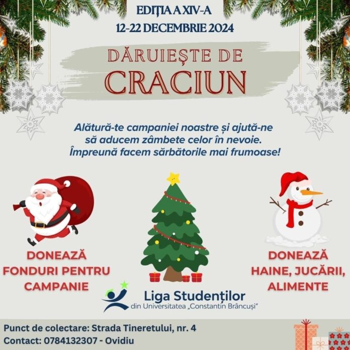 ”Liga Studenților din Universitatea „Constantin Brâncuși” te invită să te alături campaniei noastre caritabile! Împreună putem aduce bucurie și zâmbete familiilor aflate în nevoie. Cum poți ajuta? Donează fonduri pentru campanie, haine, jucării, alimente. Punct de colectare: str. Tineretului, nr. 4, Târgu Jiu. Contact: Ovidiu-Alexandru Baloșin – 0784 132 307. Împreună facem sărbătorile mai frumoase!”, au transmis organizatorii campaniei caritabile.