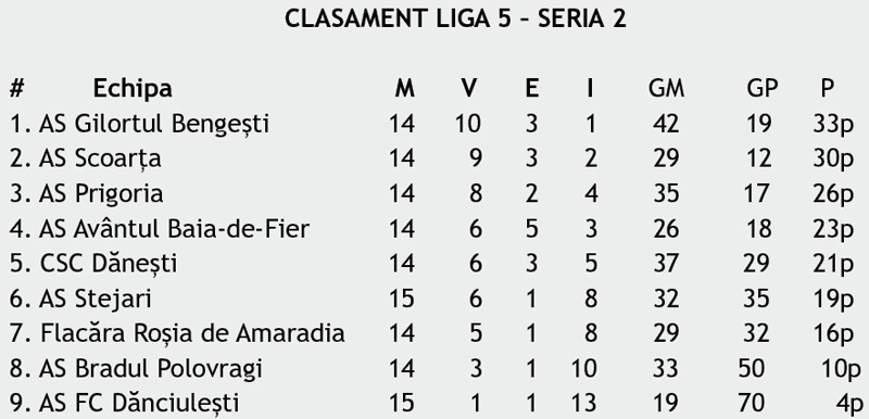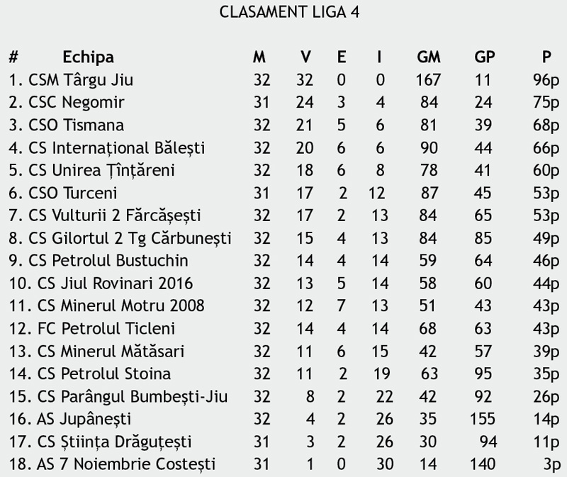 Două etape mai rămân din Liga 4, acolo unde se cunosc deja primele două poziții, ocupate de CSM Târgu Jiu și CSC Negomir, și din Seria 2 a Ligii 5, unde lider este AS Gilortul Bengești.