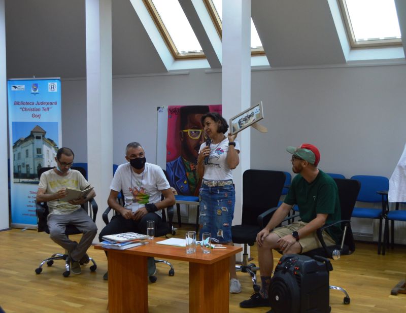 „De trei ani, „cultura străzii trece și prin bibliotecă” în timpul Festivalului Strad’Art! Parafrazăm pe Don Adrián Oniga, curatorul Strad’Art 2021 | Festival de Artă Urbană | Târgu Jiu, 9-15 August 2021 | Ediția a III-a | REVOLUȚIE pentru că a surprins esența motivației noastre de a face parte din această platformă de exprimare democratică, incluzivă, care este acest festival ce face posibilă întâlnirea oamenilor cetății cu arta. Strad’Art Books | MANSARD(T)A Bibliotecii Județene „Christian Tell” Gorj, evenimentul pe care l-am găzduit aseară, a fost un adevărat răsfăț pentru noi, bibliotecarii, și pentru invitații noștri. Am avut alături artiști din festival – Pisica Pătrată, Wanda, Sergiu Georgian Mazerschi, artiști valoroși din comunitatea târgujiană – Cătă Negrea, Cătălin Alexandrescu și alții, voluntari, prieteni ai festivalului și bibliotecii. Răsfățul a început cu lansarea volumului „155 de ani de Benzi Desenate în România 1860-2015”, București 2021, rodul unei munci laborioase pe care Alexandru Ciubotariu a făcut-o cu acribie timp de 11 ani pentru a o aduce în fața noastră.