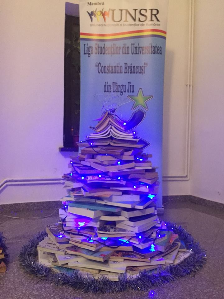 Voluntarii din cadrul Ligii Studenților din Universitatea „Constantin Brâncuși” din Târgu-Jiu au strâns cărţi de la studenţi, pe durata lunii decembrie. Din cărţile donate, studenţii au construit în holul Facultăţii de Ştiinţe Tehnice, Medicale şi Comportamentale, un brad de Crăciun, acesta fiind simbolul sărbătorilor de iarnă. Prin această iniţiativă, studenţii doresc să promoveze cultura în rândul tinerilor, în special celor cu posibilităţi materiale reduse. Astfel, pentru că sărbătorile de iarnă au trecut, cărţile din care a fost construit bradul, vor fi donate copiilor din cadrul Centrului Școlar pentru Educație Incluzivă Târgu-Jiu.