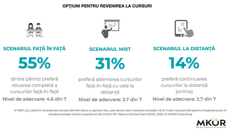 Ministerul Educației și Cercetării, prin Unitatea de Cercetare în Educație din Cadrul Centrului Național de Politici și Evaluare în Educație și MKOR Consulting – agenție de cercetare de piață – au lansat studiul „Back to School Post-Covid”. Studiul s-a derulat în rândul părinților copiilor din învățământul preuniversitar, pentru a afla care sunt așteptările și temerile lor referitoare la modul de desfășurare a noului an școlar. Conform studiului menționat, pentru revenirea la cursuri în această toamnă, majoritatea părinților români preferă scenariul cursurilor față în față, pe care îl consideră cel mai potrivit. Mai exact, 55% dintre părinții care au răspuns studiului preferă revenirea fizică a elevilor în clase din 14 septembrie. Cursurile față în față sunt preferate, mai ales, în cazul preșcolarilor și elevilor de liceu. ,,Chiar dacă se arată precauți în privința acestei opțiuni, părinții consideră că desfășurarea cursurilor față în față este relativ adecvată pentru copiii lor (4,6 puncte din 7) și, o consideră cea mai adecvată, în comparație cu varianta mixtă sau cea la distanță. În general, părinții sunt deschiși tuturor modalităților propuse pentru derularea cursurilor față în față, însă cea mai agreată modalitate este aceea ca, în măsura în care este posibil, orele să fie ținute în aer liber, sub forma laboratoarelor, iar accentul să fie pus pe partea practică a educației (6.3 puncte din 7 posibile). În ceea ce privește limitarea răspândirii virusului, părinții consideră că stabilirea și comunicarea clară a regulilor de igienizare pentru elevi, profesori și a unității școlare reprezintă principalul set de măsuri ce ar trebui luat de autorități. Aspectele ce țin de filtrarea epidemiologică și limitări ale copiilor, precum purtarea măștii în interior, tind să fie mai puțin agreate, în special de către părinții copiilor mici (rezistența părinților la măsura de purtare obligatorie a măștii de către copii este invers proporțională cu vârsta acestora). Principala îngrijorare a părinților se leagă de neatenția copiilor față de regulile de distanțare fizică și igienă (mai mult de 6 din 10 părinți), dar și de faptul că unii părinți și-ar putea trimite copiii la școală, chiar dacă prezintă simptome”, arată studiul.