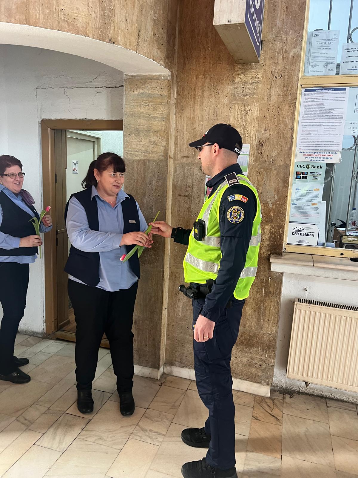 Echipe de agenți au oferit flori în zona gării din Târgu Jiu, atât pentru angajatele, cât și pentru doamnele și domnișoarele întâlnite în împrejurimi.