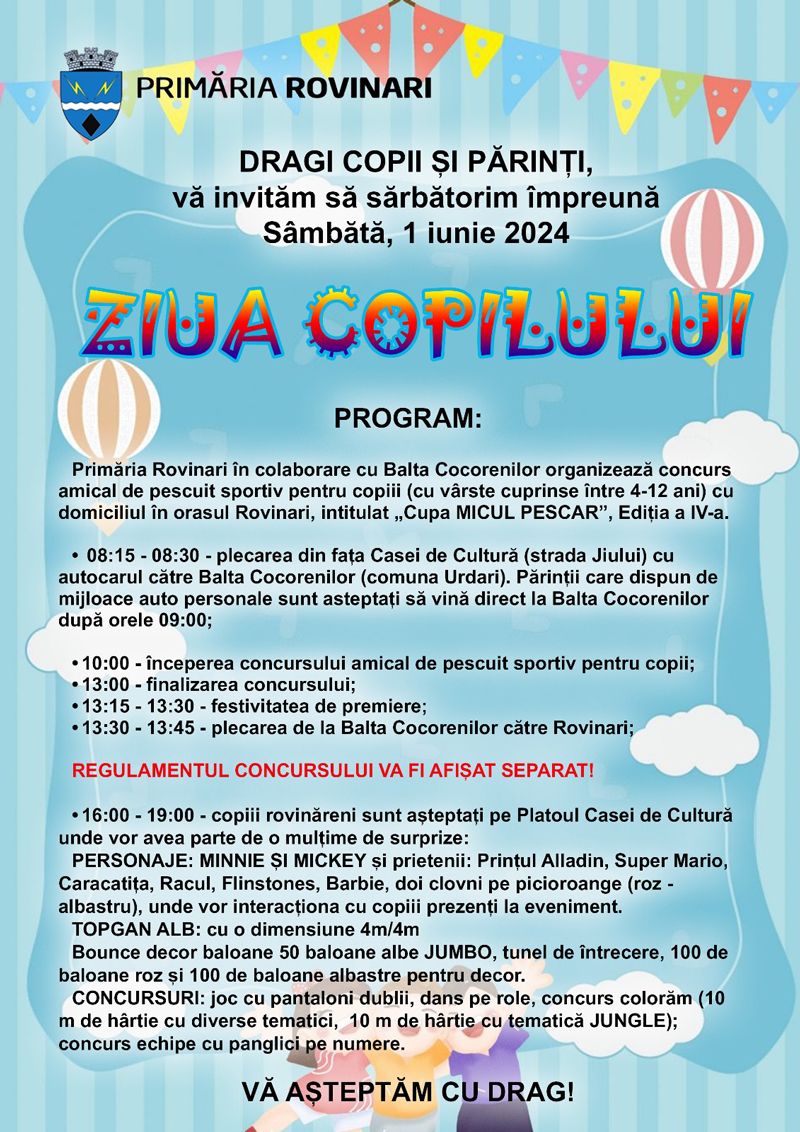 În prima parte a zilei de 1 iunie, autoritățile din Rovinari, în colaborare cu Balta Cocorenilor, organizează un concurs amical de pescuit sportiv pentru copiii cu vârste cuprinse între 4 și 12 ani. Pentru deplasare, Primăria Rovinari va pune la dispoziție un autocar. Ulterior finalizării competiției, va avea loc festivitatea de premiere. De asemenea, la orele amiezii, copiii rovinăreni sunt așteptați pe platoul Casei de Cultură din oraș. Acolo vor avea întâlnire cu personaje de desene animate, clovni, dar vor fi pregătite și concursuri cu diverse tematici pentru micuți. ,,Dragi copii, pe 1 Iunie, vă invităm să petrecem împreună clipe de neuitat! În prima parte a zilei, așa cum v-am obișnuit de câțiva ani, sunteți invitați la o partidă de pescuit sportiv. Aveți totul inclus. Transport, ustensile de pescuit cu care veți rămâne la finalul zilei, premii și diplome care să vă ateste calitatea de pescar iscusit. Concursul este destinat copiilor din orașul Rovinari, cu vârste cuprinse între 4 și 12 ani. Înscrierile pentru concurs se vor face la sediul Primăriei Rovinari, la numărul de telefon 0253371095, sau printr-un e-mail la adresa office@primariarovinari.ro, până cel târziu la data de 31.05.2024, ora 14.00. În cea de-a doua parte a zilei, între orele 16:00 și 19:00, continuăm cu o distracție pe cinste pe Platoul Casei de Cultură. Vă așteptăm cu drag!”, este mesajul transmis de primarul orașului Rovinari, Robert Filip.