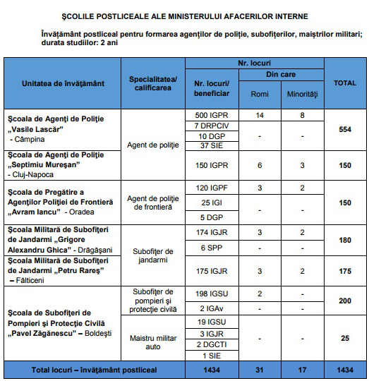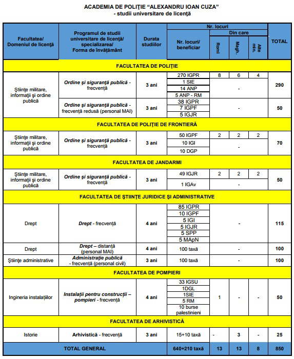 La Academia de Poliție sunt scoase la concurs 830 de locuri, la nivel național, din care 620 sunt fără taxă și 210 cu taxă. Prima etapă, cea eliminatorie, constă în vizita medicală şi probe sportive. Aceasta are loc în perioada 27 iulie-3 august. Pe 5 august vor fi anunţate rezultatele. În intervalul 6-8 august, candidaţii susţin probele scrise la limba română, o limbă străină şi istorie. Rezultatele finale vor fi anunţate pe 11 august. Totodată, școlile postliceale ale Ministerului Afacerilor Interne scot la concurs 1.434 de locuri pentru agenți de poliție, agenți de poliție de frontieră, subofițeri de jandarmi și subofițeri de pompieri și protecție civilă. Concursurile de admitere la şcolile postliceale ale MAI se desfăşoară în perioada 02 – 10 septembrie 2017. MAI beneficiază şi de 123 de locuri la instituţiile de învăţământ ale altor structuri din sistemul de ordine publică şi siguranţă naţională. Candidații trebuie să nu aibă antecedente penale sau să nu fie în curs de urmărire penală ori de judecată pentru săvârşirea de infracţiuni, cu excepţia situaţiei în care a intervenit reabilitarea, să nu fi fost destituiţi dintr-o funcţie publică în ultimii șapte ani și să nu fi desfăşurat activităţi de poliţie politică.