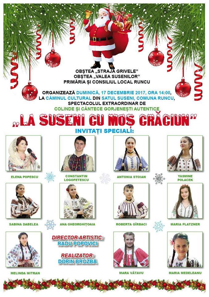 Obștea Straja Grivele, Obștea Valea Susenilor, Primăria și Consiliul Local Runcu organizează un spectacol extraordinar de colinde și cântece gorjenești autentice “La Suseni cu Moș Crăciun”. Aproximativ 400 de persoane și-au manifestat dorința de a participa la eveniment, astfel că gazdele au decis să schimbe locația spectacolului, care inițial era la Căminul Cultural din Satul Suseni. Astfel, manifestarea artistică va avea loc la Căminul Cultural Frătești, cu această ocazie inaugurându-se instituția de cultură, care recent a beneficiat de lucrări de modernizare pe fonduri europene.