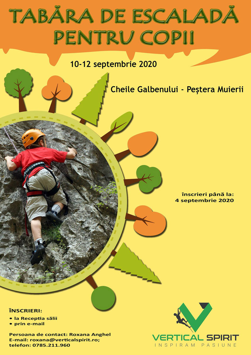 „Escalada înseamnă joacă, mișcare, provocare, distracție. Practicată în mijlocul naturii, escalada aduce numeroase beneficii copiilor, atât fizice, cât și mentale și educaționale. În plus copiii vor explora natura, se vor juca în aer liber și vor avea experiențe noi și variate. Încurajează-ți copilul să practice activități sportive în natură! Escalada îl va ,,prinde” cu siguranță, dându-i încredere în forțele proprii și ajutându-l să se cunoască. În zona de campare este acces auto, iar la falezele de cățărare se ajunge foarte ușor. Există multe trasee de escaladă accesibile pentru copii. Ne propunem să susținem activitățile potrivite pentru a stimula dorința naturală a copiilor de a învăța lucruri noi și de a se cunoaște mai bine odată cu atingerea și depășirea limitelor, crescându-și astfel stima de sine. Copiii, ca și adulții, sunt motivați să învețe și să acționeze atunci când mediul le oferă anumite provocări stimulatoare și le fac cu bucurie. Aventura va face ca și ceea ce au descoperit să se fixeze mult mai usor. De aceea dorim să le oferim copiilor o tabără de neuitat cu multă bucurie, relaxare și plăcere de viață. La această tabără pot participa copii cu vârste cuprinse între 6 și 16 ani, indiferent de nivelul lor în practicarea escaladei. Va fi un stagiu sportiv, în jumătate din zi copiii se vor cățăra, iar în cealaltă jumătate vor avea un alt tip de activitate care poate fi un joc de tip Aventură (leagăn, traversarea râului sau altceva) sau o vizită sau drumeție (de ex. vizitarea Peșterii Muierii). Se va sta la cort în apropierea drumului auto într-o zonă în care camparea este permisă. Masa o vom servi sub formă de picnic, la locul de campare și vom alterna și cu servirea mesei la restaurant într-una dintre serile taberei. Tariful este de 750 de lei de copil, iar acest tarif include: transport, masă, echipament specific, instruirea în escaladă, organizarea și atelierele de tip aventura din tabără. Pentru frați se acordă un discount de 50 de lei / copil. Este bine ca fiecare copil să aibă echipament de campare propriu: sac de dormit, izopren, cort”, au transmis organizatorii evenimentului.