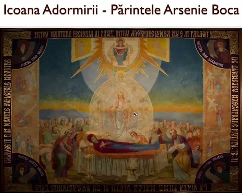Taina adormirii şi a înălţării la cer a Maicii Domnului reprezintă o expresie arhetipală a Născătoarei de Dumnezeu, cu implicare eshatologică, ea fiind rodirea în umanitate a lui Dumnezeu, Iubitorul de oameni, pentru că în ultimă instanţă, Fecioara Maria este persoana cea mai curată și neprihănită din neamul omenesc, alegerea cea de taină pentru Întruparea lui Dumnezeu Cuvântul! Sfântul Cuvios Mărturisitor Arsenie Boca ne vorbeşte despre importanța rugăciunii la Maica Domnului, mijlocitoarea creștinilor în fața lui Dumnezeu, considerând că ea este modelul desăvârşit de curăţie şi iubire, duse până la jertfă, căci, spre a ajunge la refacerea noastră, trebuie să trecem prin multe răstigniri şi să avem trebuinţă de o inimă de mamă pentru noi către Dumnezeu! Prin asceză şi iubire, sufletul nostru trebuie să ajungă la curăţia sufletului-fecioară, în care se va naşte chipul nostru veşnic, iar, dacă viaţa noastră s-ar reduce numai la viaţa aceasta pământească, cea între leagăn şi mormânt, toată osteneala vieţii ar fi fără sens. Dar, viaţa noastră nu e numai atâta, pentru că Taina adormirii şi a înălţării la cer a Maicii Domnului ne dovedeşte că învierea ei este prevăzută de Dumnezeire îndată după căderea omului, cu atât mai mult cu cât pomenirea ei, pune din plin problema refacerii omului, a spus de multe ori Sfântul Arsenie Boca. În concluzie, Maica Domnului este dovada supremă a desăvârşirii spirituale a legilor firii create, dar și persoana în care, în mod profetic și tipologic, eshatonul sau învăţătura despre realităţile ultime ale fiinţării se exprimă astfel: „Întru naștere fecioria ai păzit, întru adormire lumea nu o ai părăsit de Dumnezeu Născătoare, mutatu-te-ai la viață, ceea ce ești Maica vieții și cu rugăciunile tale izbăvești din moarte sufletele noastre”! Aşadar, Icoana Maicii Domnului de adormire a trupului în Dumnezeu devine poartă a vieții veșnice împreună cu Hristosul Care a biruit moartea pentru veşnicie! Mutarea Maicii Domnului «de la adormire la înălţare, şi, deci, la viață veşnică, prin înălţarea de la pământ la cer» este întorcerea firească la Fiul ei pe care L-a iubit cu iubire veșnică, Biserica numind-o pentru totdeauna ca fiind «Maica vieții și raza zilei celei de Taină»!