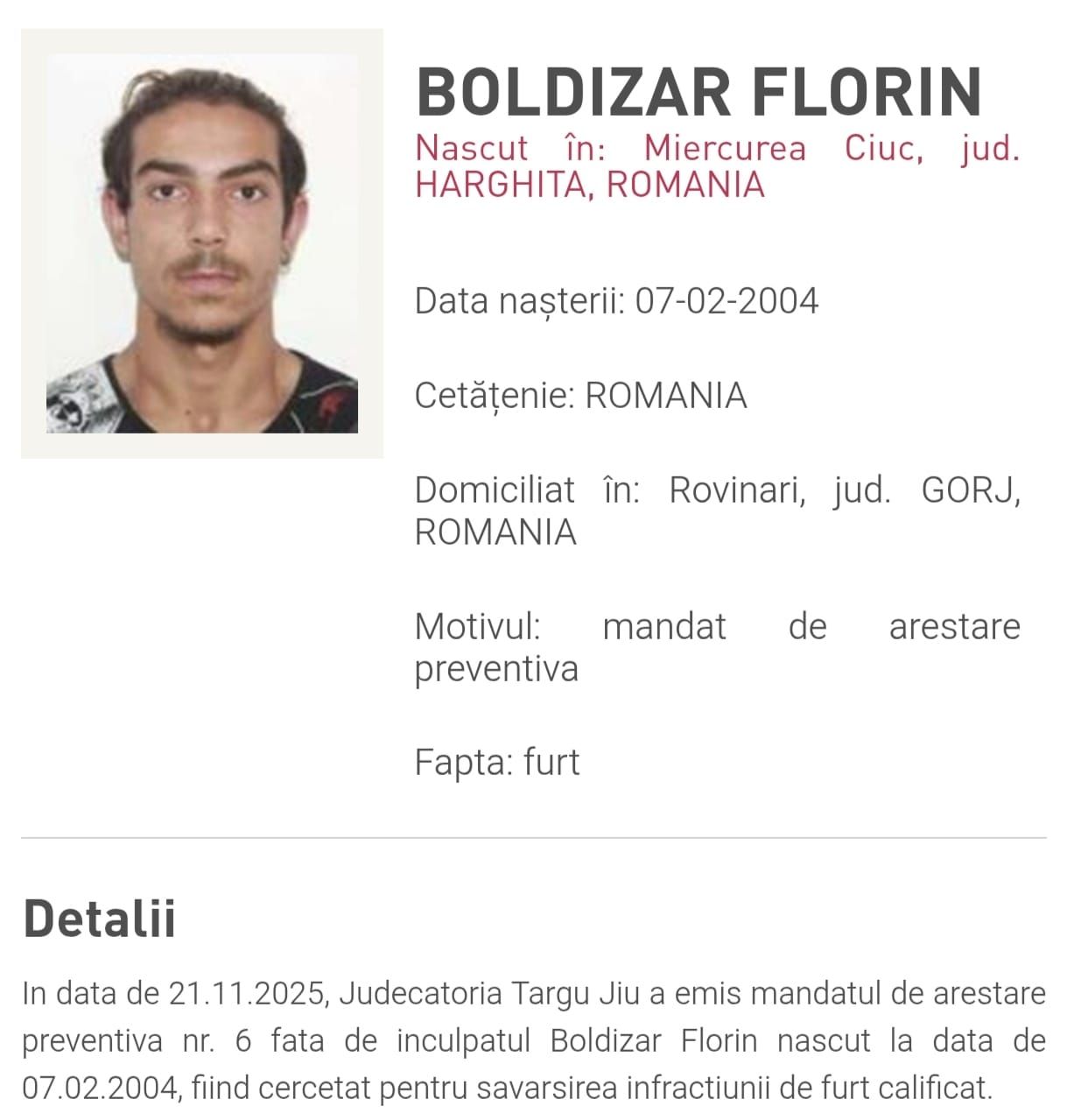 Pe 18 noiembrie 2025, magistrații Judecătoriei Târgu Jiu au dispus înlocuirea măsurii controlului judiciar cu cea a arestului preventiv, în contextul în care tânărul fusese anterior plasat sub supraveghere judiciară, după o serie de fapte comise atât anul trecut, cât și în vara anului curent. Instanța a făcut această schimbare argumentând că există un risc ridicat ca inculpatul să nu respecte obligațiile impuse, având în vedere comportamentul său recidivant. Decizia instanței a devenit definitivă prin necontestare, iar vineri, 21 noiembrie, Judecătoria Târgu Jiu a emis mandatul de arestare preventivă nr. 6 pe numele lui Florin Boldizsar, născut la 7 februarie 2004, cercetat într-un dosar complex ce include mai multe acte de furt. În momentul în care polițiștii au mers la domiciliul său pentru punerea în executare a mandatului, tânărul nu a mai fost găsit.