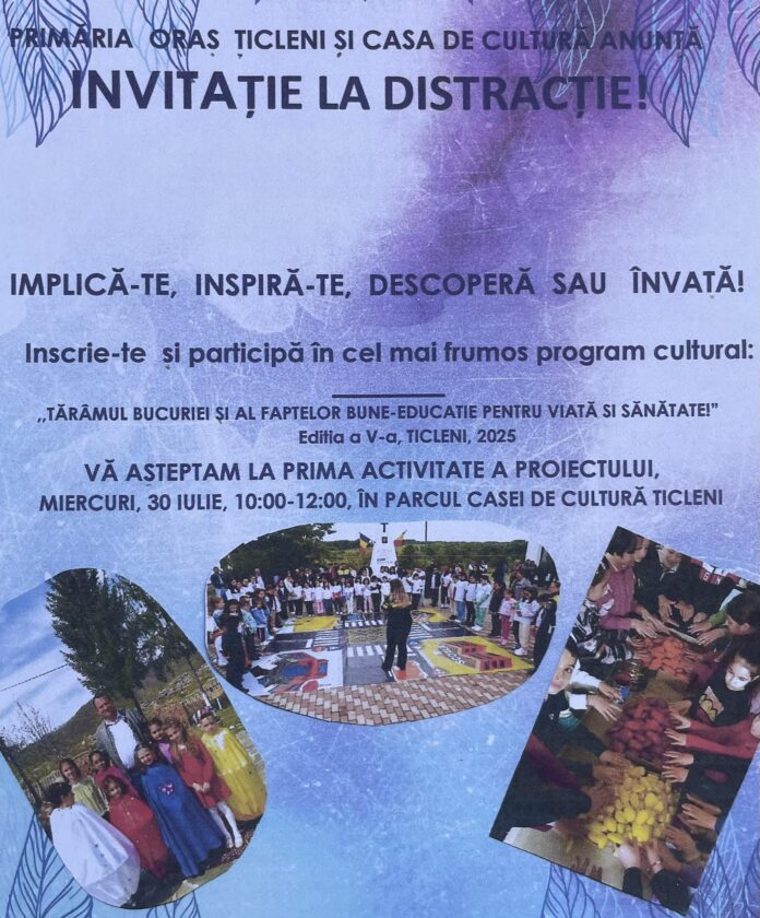 Primăria Orașului Țicleni și Casa de Cultură lansează mâine, 30 iulie 2025, prima activitate din cadrul proiectului „Tărâmul bucuriei și al faptelor bune – Educație pentru viață și sănătate!”, ajuns anul acesta la ediția a V-a.