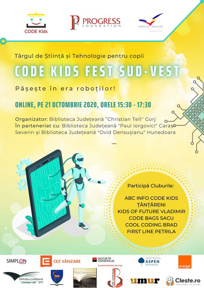 Biblioteca Județeană ,,Christian Tell” Gorj, în parteneriat cu Biblioteca Județeană ,,Paul Iorgovici” Caraș-Severin și cu Biblioteca Județeană ,,Ovid Densușianu” Hunedoara, va organiza în data de 21 octombrie 2020, orele 15.30-17.30, CODE Kids FEST Sud-Vest – Târgul de Știință și Tehnologie pentru Copii.