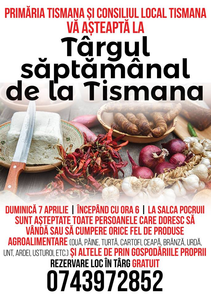Fostul târg de animale de la Tismana va deveni piață agroalimentară. Târgul va funcționa în fiecare săptămână, începând din 7 aprilie. „Venim în sprijinul cetățenilor, să poată comercializa produsele animaliere, vegetale, dar și mărfuri industriale, obiecte de uz casnic, unelte, textile”, a anunțat primarul Marian Slivilescu. Târgul de animale a fost inaugurat în vara lui 2014, dar a fost închis odată cu apariția bolii limbii albastre. „Invităm toți producătorii locali, mici și mari, de produse agroalimentare și nealimentare să își vândă produsele în târg. Accesul persoanelor care doresc să vândă în cadrul târgului este gratuit, în limita spațiului disponibil”, anunță organizatorii.