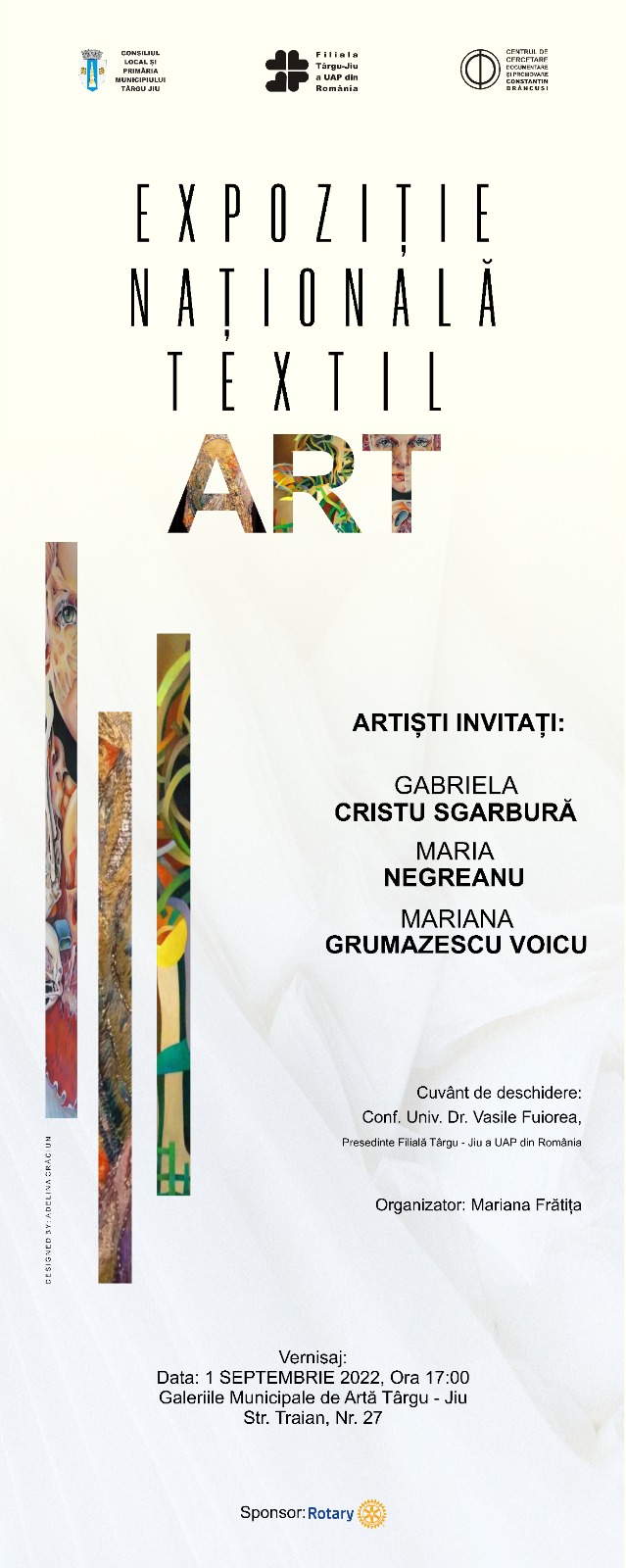 Filiala Târgu Jiu a Uniunii Artiștilor Plastici din România, în parteneriat cu Centrul de Cercetare Documentare și Promovare ,,Constantin Brâncuşi” și Primăria Municipiului Târgu Jiu, organizează în data de 1 septembrie, ora 17.00, la Galeriile de Artă ,,Constantin Brâncuși” din Târgu Jiu, vernisajul expoziției naționale de Arte Vizuale ,,TEXTIL ART”.