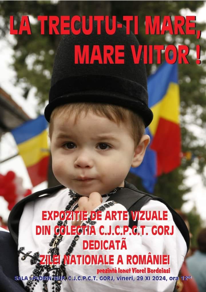 „Prin această expoziție, dorim să evidențiem importanța păstrării identității noastre culturale și să aducem în prim-plan frumusețea obiceiurilor și tradițiilor strămoșești. Instituția noastră a organizat, de-a lungul anilor, numeroase manifestări dedicate Zilei Naționale a României. Ne mândrim că suntem un pilon al promovării culturii tradiționale și că oferim gorjenilor oportunități de a redescoperi și celebra valorile naționale. Programul zilei va include și surprize muzicale care vor întregi atmosfera de sărbătoare. Avem invitat Grupul “Privighetorile Gorjului” condus de doamna profesor Emilia Drăgotoiu Nanu. Curatorul expoziției „La trecutu-ți mare, mare viitor!” este cunoscutul fotograf, Teodor Dădălău, deținător al plachetei de aur din partea Asociației Artiștilor Fotografi din Romania (AFFR 1995). Expoziția de arte vizuale din colecția CJCPCT Gorj va fi prezentată de noul manager al instituției, Ionuț Viorel Bordeiași”, au anunțat reprezentanții instituției județene.