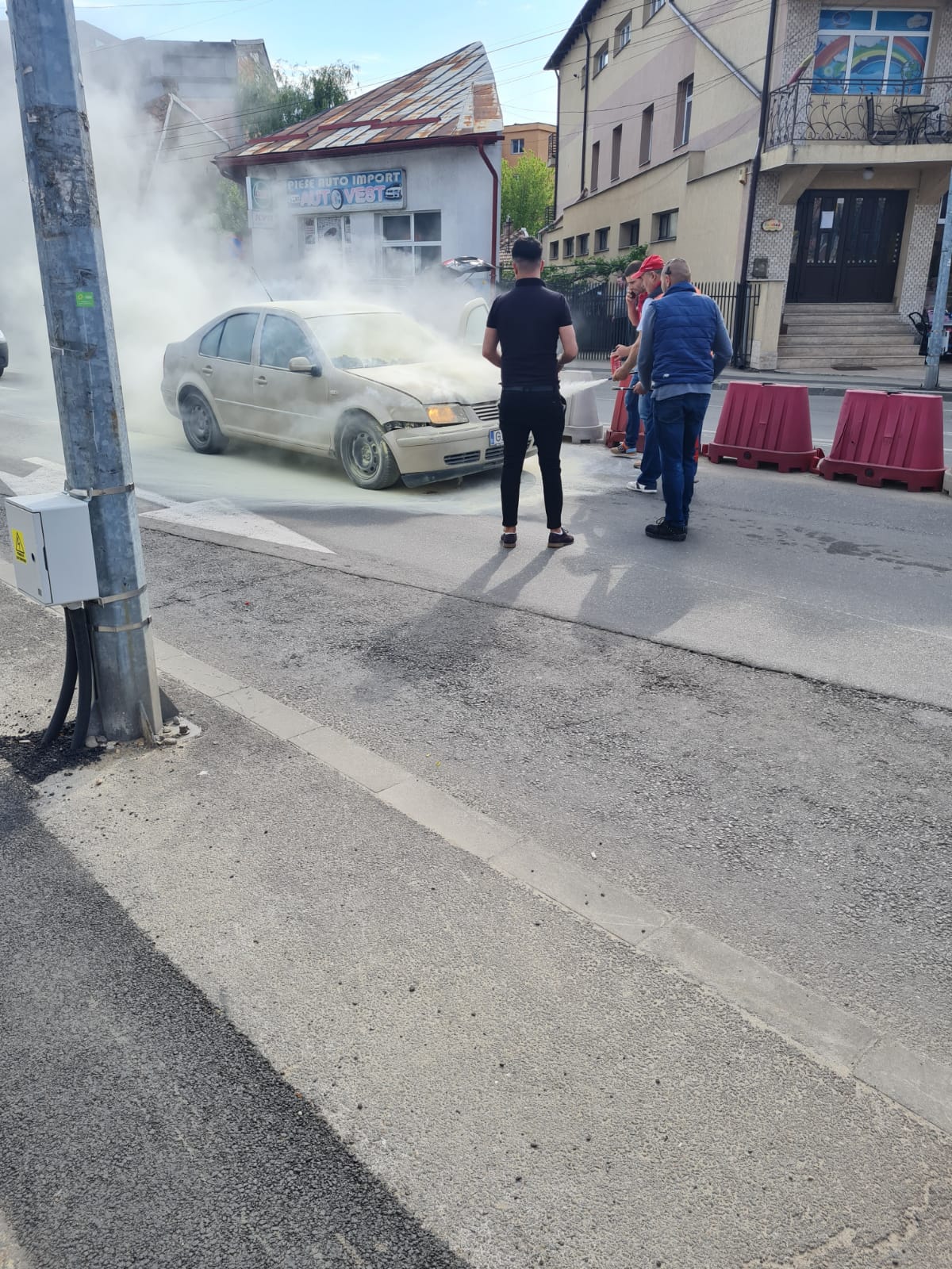 Un autoturism a luat foc, în mers, pe strada Victoria din Târgu Jiu. În ajutorul șoferului au sărit salariații unei firme private aflate în apropiere. Mașina a fost avariată în partea din față.