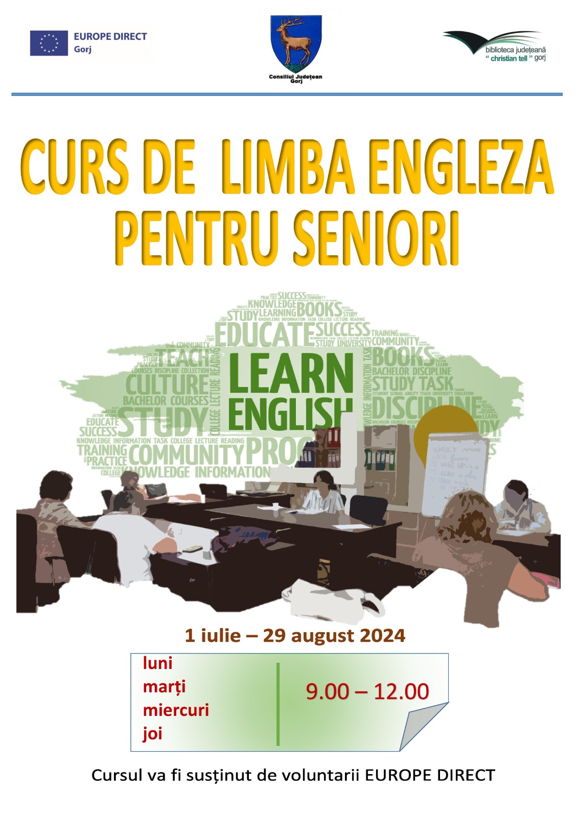 ”În perioada 1 iulie – 29 august 2024, Centrul Europe Direct Gorj organizează Cursul de limba engleză pentru seniori! Cursul va avea loc la Biblioteca Județeană Gorj, structura gazdă a Europe Direct Gorj, la etajul 2, în Centrul de formare. Programul: luni-joi, între orele 9:00-12:00. Cursul va fi susținut de voluntarii Europe Direct Gorj”, au anunțat inițiatorii proiectului.