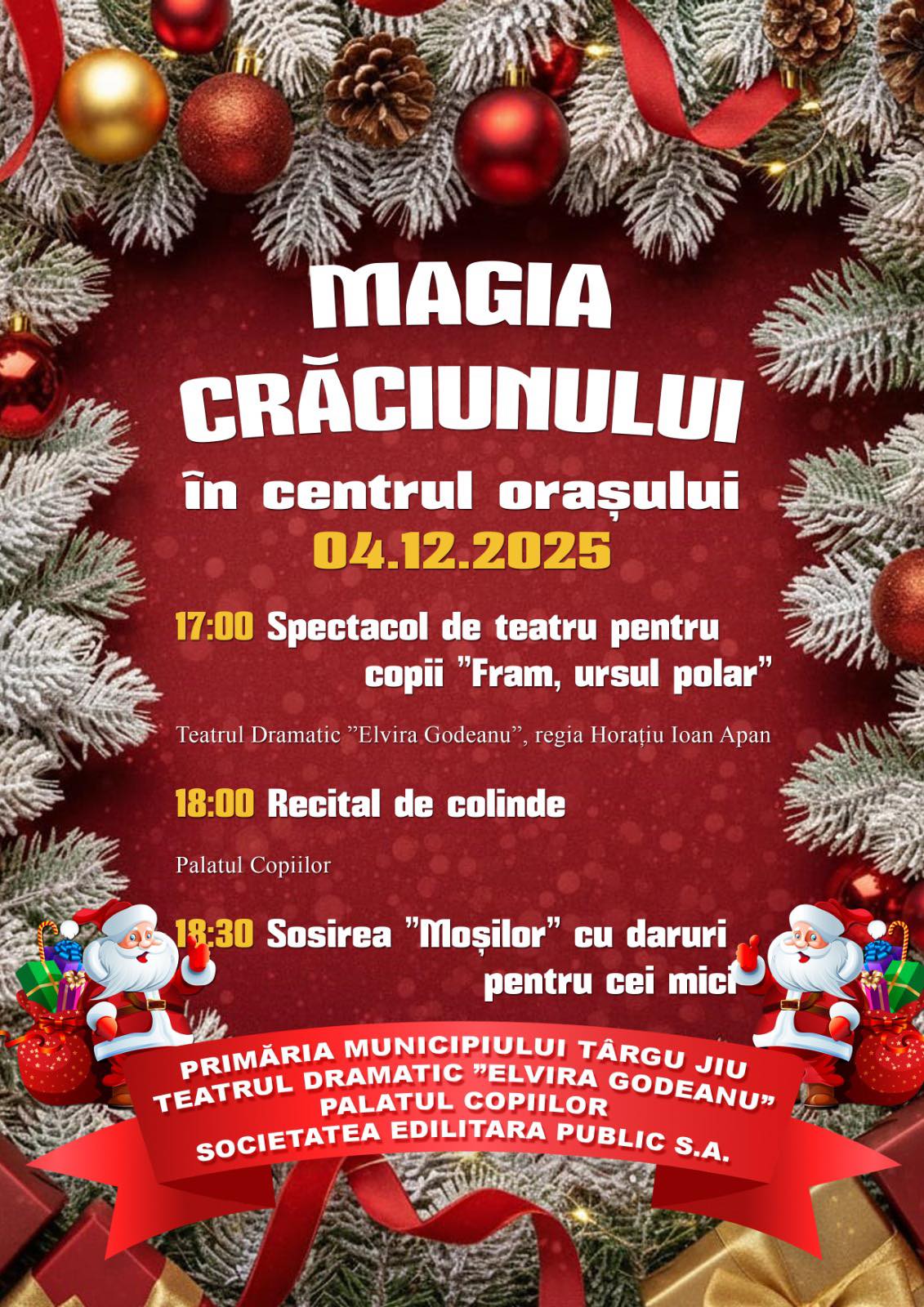 Primăria Municipiului Târgu Jiu, în colaborare cu Teatrul Dramatic „Elvira Godeanu”, Palatul Copiilor Târgu Jiu și Edilitara Public S.A., vă invită joi, 4 decembrie 2025, la un eveniment plin de emoție pentru cei mici și cei mari – „Magia Crăciunului în centrul orașului”. Evenimentul începe la ora 17:00, în Piața Prefecturii.