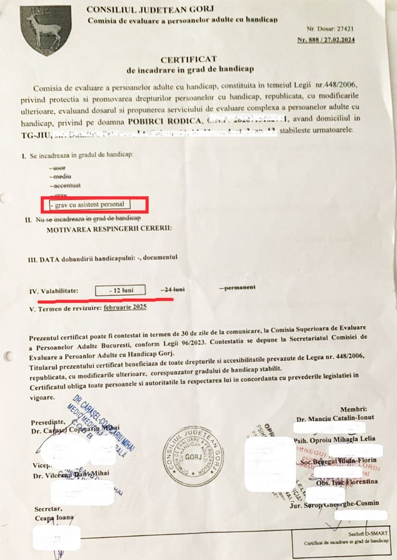 În februarie 2024, o altă comisie, cea de Evaluare a Persoanelor Adulte cu Handicap din cadrul DGASPC Gorj a stabilit, conform aceleiași documentații, grad de handicap ,,grav cu asistent personal”. Totul era valabil până în februarie 2025.