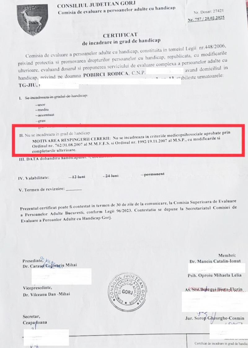 Numai că, pe 20 februarie a.c., aceeași Comisie de evaluare a persoanelor adulte cu handicap din cadrul DGASPC Gorj, prezidată de medicul Mihai Cărășel Cojocariu, care acordase, cu un an în urmă, grad de handicap grav cu însoțitor, a stabilit că femeia nu mai îndeplinește prevederile legale de încadrare în grad de handicap.