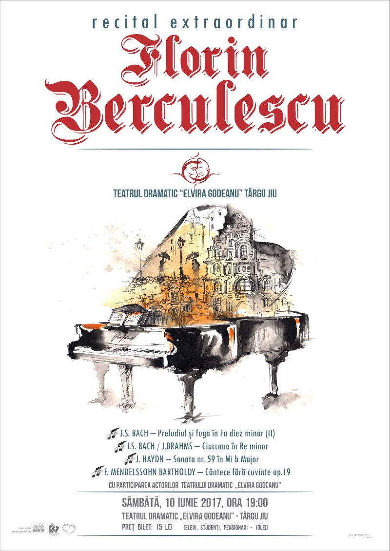 Compozitorul, profesorul şi pianistul Florin Berculescu va veni, din nou, în faţa iubitorilor de muzică clasică din municipiul Târgu-Jiu cu un nou recital extraordinar, concertul de luna aceasta remarcându-se cu arii din Bach, Haydn şi Mendelssohn Bartholdy. Spectacolul este programat pentru sâmbătă, 10 iunie, de la ora 19.00, la Teatrul Dramatic “Elvira Godeanu” din Târgu-Jiu. Preţul unui bilet este de 15 lei, iar pentru elevi, studenţi şi pensionari intrarea va fi de 10 lei.
