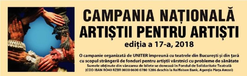 Realizată în parteneriat cu instituţiile de teatru din Bucureşti şi din ţară, Campania “Artiştii pentru artişti” vine în sprijinul oamenilor de teatru care au nevoie de ajutor, prin spectacole oferite în numele cauzei artiştilor noştri pentru care scena rămâne o frumoasă amintire. În urma UNITER, 18 teatre din Bucureşti şi 31 teatre din ţară au programat deja pe tot parcursul lunii martie, şi nu numai, spectacole de teatru ale căror încasări vor alimenta Fondul de Solidaritate Teatrală, fond special constituit pentru întrajutorarea artiştilor cu probleme de sănătate şi existenţă. Campania Naţională “Artiştii pentru artişti” a fost iniţiată în anul 2002 cu scopul sensibilizării opiniei publice în vederea strângerii de fonduri pentru artiştii vârstnici cu probleme de existenţă şi sănătate din toată ţara. “Artiştii pentru Artişti” s-a instituit nu numai ca resort financiar, ci mai ales ca stimulator al solidarităţii artistice şi ca semnal pentru publicul de teatru şi pentru autorităţi.