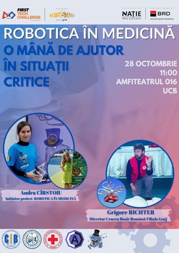 „În cadrul acestui eveniment veți avea oportunitatea de a descoperi universul fascinant al roboticii aplicate în medicină, un domeniu în continuă dezvoltare și inovație. Vom explora cum roboții pot revoluționa chirurgia, terapia fizică și diagnosticul medical, facilitând intervențiile mai precise și minim invazive, precum și îmbunătățind calitatea vieții pacienților. Alături de experți din domeniul roboticii și medicinii, veți învăța despre cele mai recente tehnologii și inovații care au potențialul de a schimba complet paradigma asistenței medicale. De asemenea, poți participa la cursul de prim ajutor ținut de Grigore Richter, director Crucea Roșie Română – filiala Gorj”, este mesajul transmis de organizatorii evenimentului de mâine.