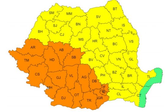 Meteorologii au emis Cod portocaliu privind un val de căldură, caniculă, disconfort termic accentuat, miercuri, în judeţele Arad, Timiş, Caraş-Severin, Hunedoara, Alba, Sibiu, Vâlcea, Gorj, Mehedinţi, Dolt, Olt, Argeş, Dâmboviţa, Ilfov, Giurgiu, Teleorman şi în municipiul Bucureşti.