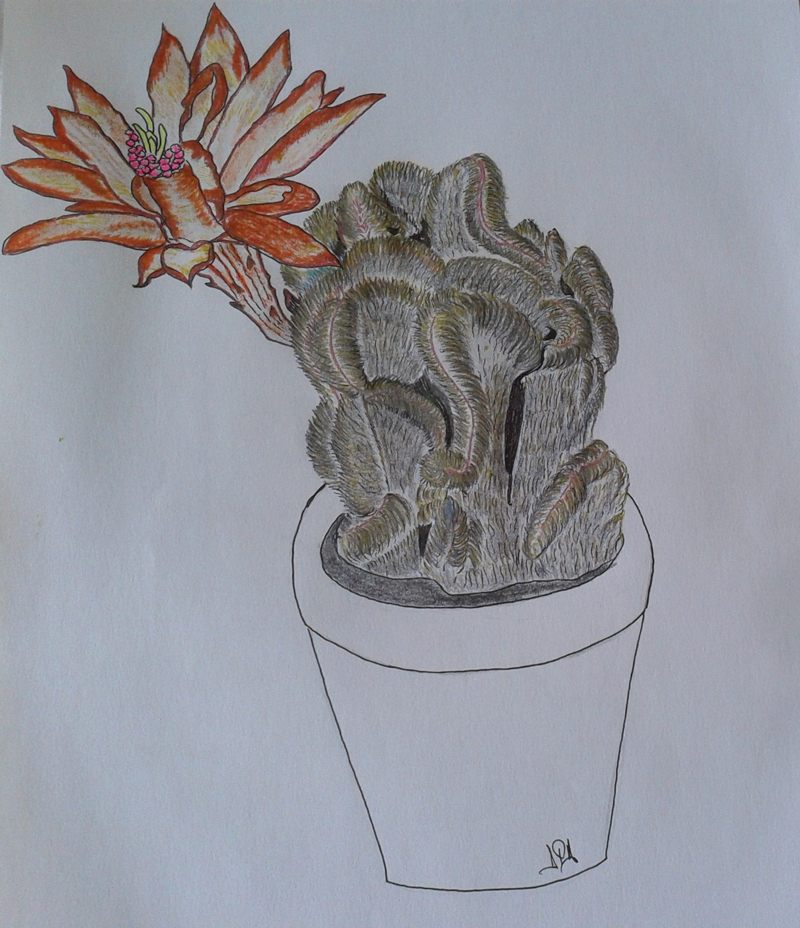 Zilele trecură ca o adiere de vânt… Nuțu avea grija țepoșilor săi: erau udați, imitând ploaia de desert (prin șuvoire de scurtă durată și rapidă absorbire a apei excedentare), dimineața îi poziționa în plin soare, rotind periodic ghivecele și schimbând expunerea, ca plantele să crească echilibrat… le făcea duș, pentru a le curăța tulpina de praf și alte impurități, iar ei .. ei bine, ei îi mulțumeau înflorind… Singur Țepoșel nu înflorise, nu încă… însă crescuse… avea mai multe coame ondulate, tivite cu țepi… Mărindu-se, primise un vas mai mare, în care se dezvoltase armonios… Arăta privirii coame de un verde crud, învăluite unele-ntr-altele, cu contururi sinuoase, ca un șarpe încolăcit vegetal… greu de ghicit unde începeau și unde se sfârșeau… Și… într-o zi, se produse minunea: coamele ondulate lăsară privirii muguri mici… care se lungiră rapid… flori în formă de pâlnie, de culoare somon, se deschiseră… Nuțu era cu telefonul pregătit… imortaliză inflorescența generoasă, apoi își sună prietenul: Cornel, vino… a înflorit!” ,,În cinci minute sunt la tine”, răsună vesel glasul prietenului său… Ajuns, Cornel nu își putu opri admirația: ,,Ăsta e cel mai frumos…”… Priviră cu dragoste la planta cu tulpini ondulate și flori viu-colorate: Mammillaria Hildewintera Aureispina Cristata…