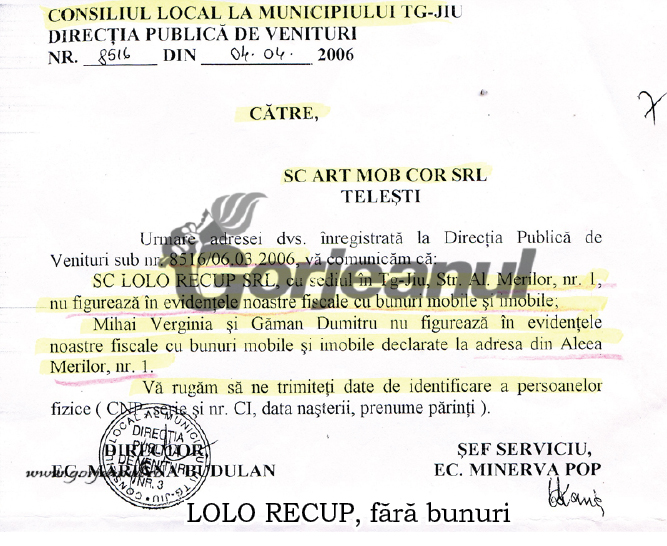 De altfel, Găman a pus la dispoziția instanței, dar și Gorjeanul plângerea penală făcută de el pentru firma ARTMOBCOR SRL din Buduhala pentru factura de 80.000 de lei, plângere ce a fost depusă la Parchetul de pe lângă Judecătoria Târgu-Jiu în 7 februarie 2006, dar și adresa făcută în 25 noiembrie 2005 către ARTMOBCOR SRL în care i se comunica firmei că LOLO RECUP SRL nu este de acord cu efectuarea plății pe factura de 80.000, deoarece “între noi și societatea dvs. Nu există niciun contract de prestări servicii consultanță”. În aceeași corespondență, firma din Telești mai este anunțată oficial că factura incorectă va fi ștornată. Găman mai arată un document relevant, eliberat de Direcția de Taxe și Impozite Locale Târgu-Jiu în aprilie 2006. Este vorba despre răspunsul instituției la momentul respectiv potrivit căreia Găman Dumitru și Mihai Verginia, reprezentanții LOLO RECUP SRL nu dețineau niciun fel de bunuri mobile și imobile la adresa Aleea Merilor nr.1. Mai exact, cei doi nu aveau niciun bun ce putea fi executat și nici sediul firmei în vila din Meteor care a fost sigilată, ilegal, în decembrie 2014.