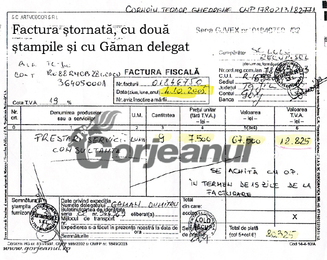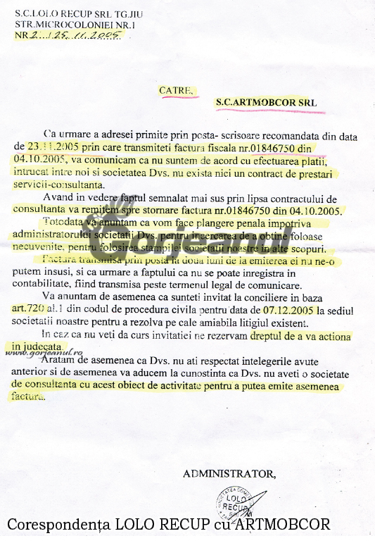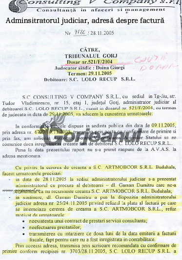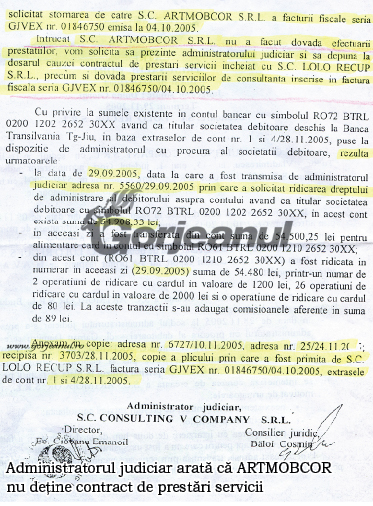 De altfel, potrivit Consulting V Company SRL, factura se transmisese LOLO RECUP cu două luni de întârziere, motiv pentru care Găman a cerut administratorului judiciar să ștorneze factura în cauză. “Întrucât ARTMOBCOR SRL nu a făcut dovada efectuării prestațiilor vom solicita să prezinte administratorul judiciar și să depună la dosarul cauzei contractul de prestări servicii încheiat cu SC LOLO RECUP SRL, precum și dovada prestării serviciilor de consultanță înscrise în factura fiscală cu seria GJVEX nr. 01846760 din 4.10.2005”, se arată în document. De fapt, la dosarul inițial al cauzei nu se găsește contractul ARTMOBCOR nici acum la 11 ani de la eliberarea facturii.