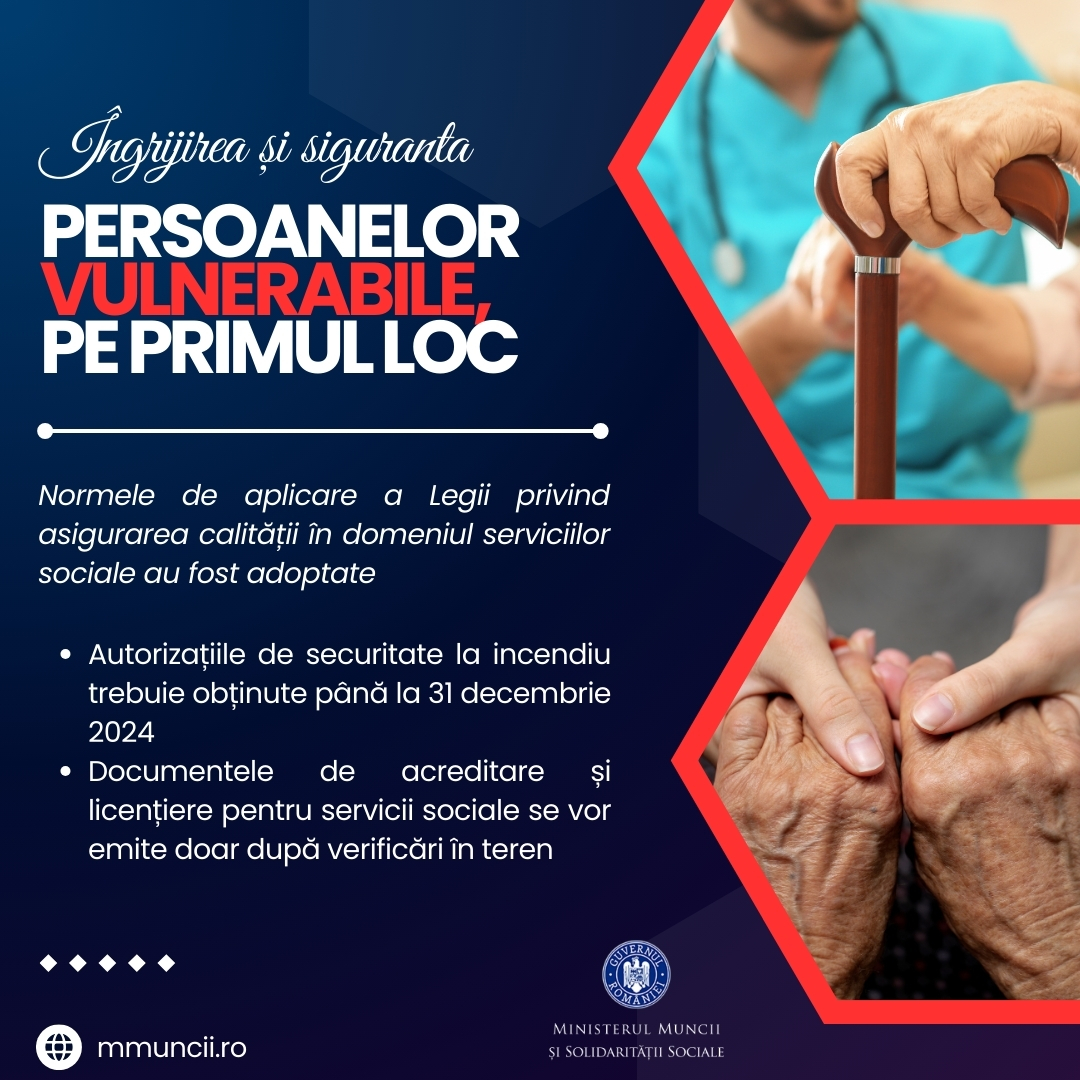 Guvernul a adoptat Normele metodologice la Legea nr.197/2012 privind asigurarea calității în domeniul serviciilor sociale, urmare a modificărilor și completărilor aduse acesteia prin Legea nr. 100/2024 care reformează sistemul de asistență din România. Actul normativ adoptat de Executiv stabilește că, în vederea licențierii și relicențierii serviciilor sociale, furnizorii de servicii sociale au termen până la 31 decembrie 2024 să obțină autorizația de securitate la incendiu sau, după caz, documentul justificativ din care să reiasă faptul că spațiul în care se asigură serviciul social nu se supune autorizării.