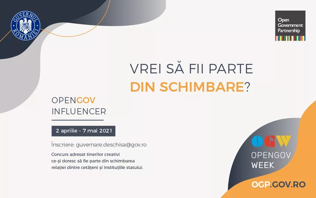 Cu ocazia Săptămânii Guvernării Deschise (OpenGov Week), 17-21 mai, Secretariatul General al Guvernului invită tinerii creativi să participe la concursul OpenGov Influencer. Cele mai creative clipuri de promovare a valorilor guvernării deschise vor fi selectate și integrate într-o campanie de informare publică destinată cetățenilor, desfășurată în Săptămâna Guvernării Deschise.