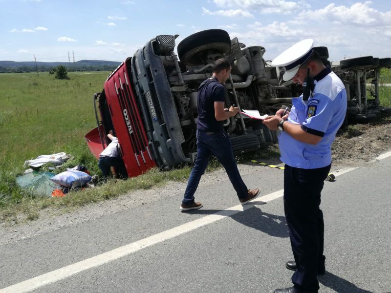 Un tir încărcat cu piatră s-a răsturnat, ieri, în șanț, după ce șoferul a încercat să evite mașina din fața sa. Evenimentul rutier a avut loc pe DE 79, în comuna Brănești.”Șoferul nu a adaptat viteza, iar în momentul în care autoturismul din față a frânat, a încercat să-l ocolească, a intrat în balans și apoi în șanț.